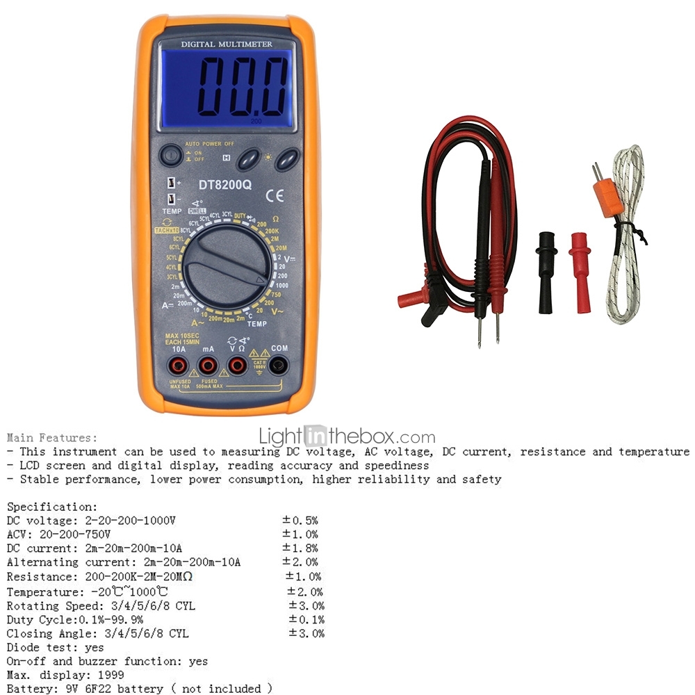 Цифровий мультиметр DT8200C виробляє вимірювання постійного і змінного струму, напруги. опору, ємності конденсаторів і коефіцієнта підсилення транзисторів.