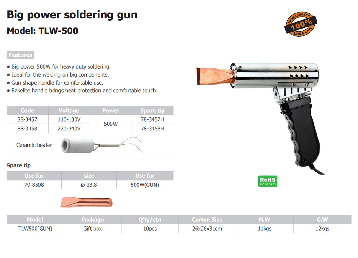 Паяльник TLW-500 з ніхромовим нагрівачем на керамічному каркасі призначений для паяння масивних деталей. Може використовуватися для лущення та паяння під час ремонту різних видів техніки (радіатори та кузові деталі автомобілів, тракторів тощо).